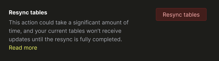 - Возможно, вам нужно внести серьёзные изменения в схему исходных таблиц, которые нарушат работу существующего ClickPipe и потребуют его перезапуска. В этом случае вы можете просто нажать Resync после внесения изменений.
